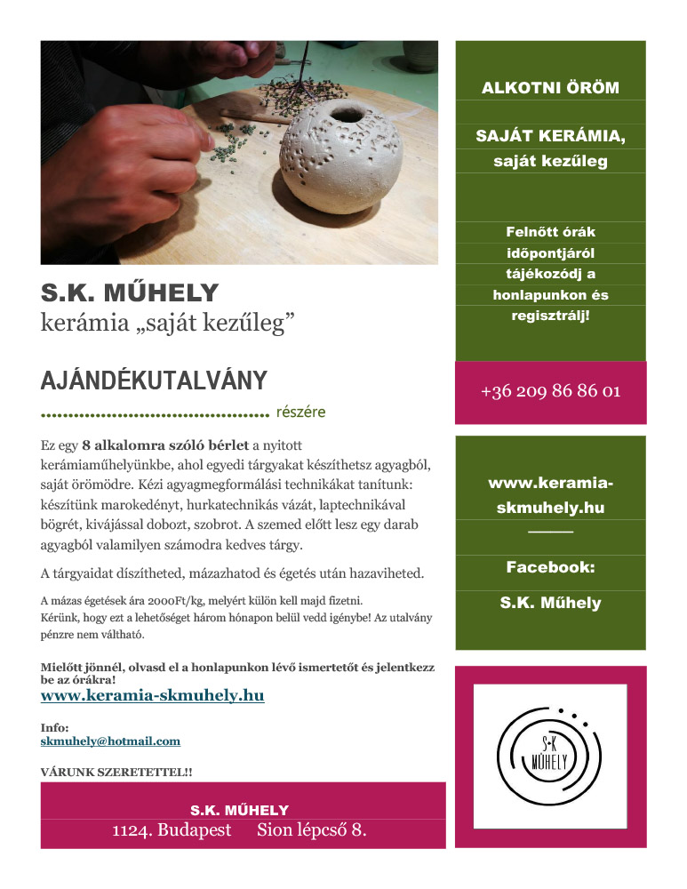 Ez egy 8 alkalomra szóló bérlet a nyitott kerámiaműhelyünkbe, ahol egyedi tárgyakat készíthetsz agyagból, saját örömödre. Kézi agyagmegformálási technikákat tanítunk: készítünk marokedényt, hurkatechnikás vázát, laptechnikával bögrét, kivájással dobozt, szobrot. A szemed előtt lesz egy darab agyagból valamilyen számodra kedves tárgy.