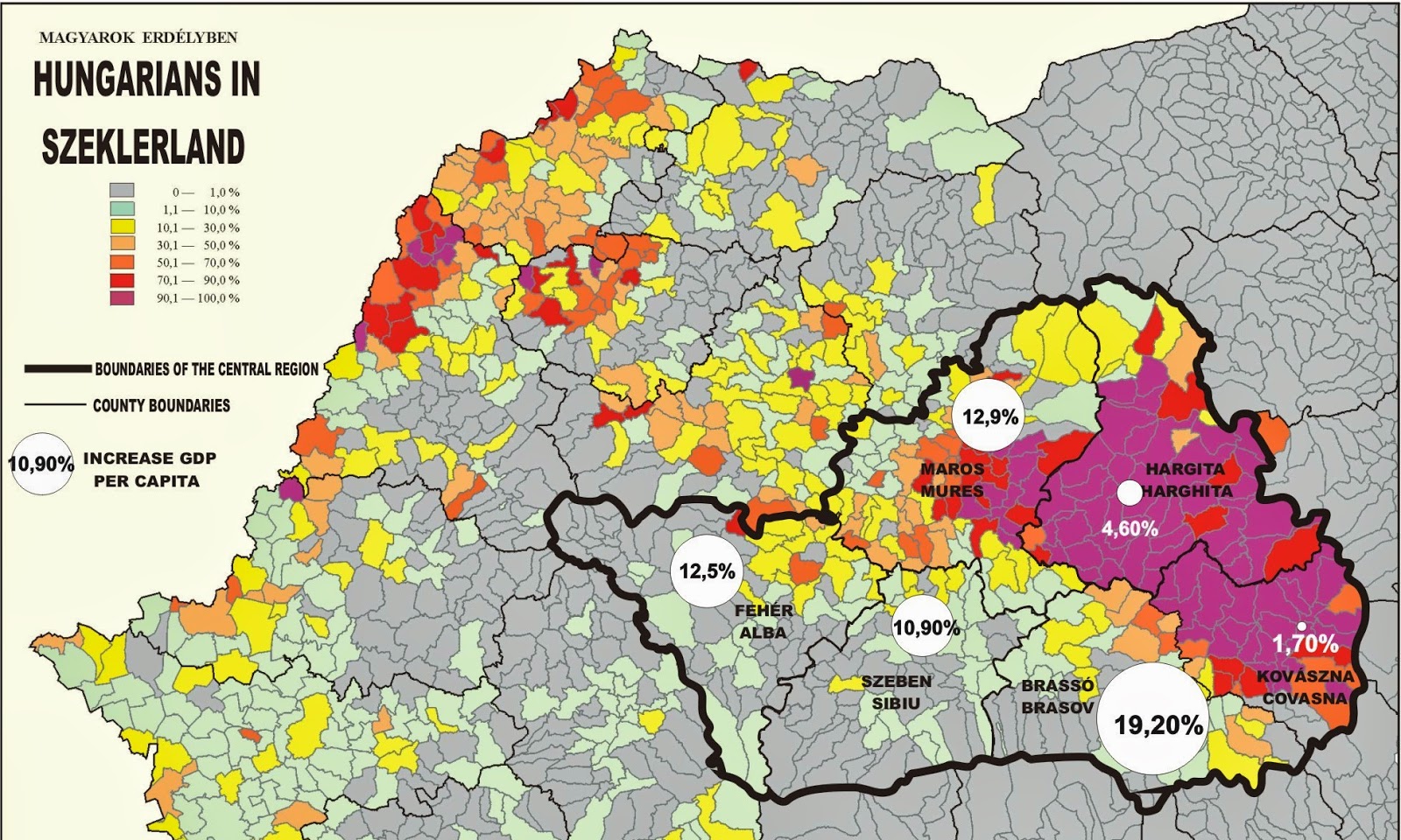 A lenti táblázat, és az egy főre eső nemzeti össztermék alakulását is feltüntető etnikai térkép mutatja Székelyföld folyamatos és mesterségesen fenntartott elszegényítését, összehasonlítva a román többségű megyékkel, amelyeket Románia regionális fejlesztési politikája előnyben részesít.