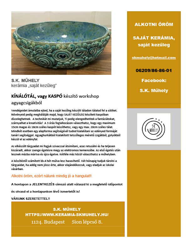 Vendégeidet ámulatba ejted, ha a saját kezűleg készült táladon tálalod fel a sütiket. Növényeid pedig meghálálják majd, hogy SAJÁT KEZŰLEG készített kaspóban díszeleghetnek.  A technikát mi mutatjuk, Ti pedig elengedhetitek a fantáziátokat, szárnyalhat a kreativitás!  A 2 órás foglalkozáson választhatsz, hogy egy maximum 15cm magas és 18cm széles kaspót készíthetsz, vagy egy max. 20cm széles tálat.  Mindkét esetben egy alapforma segítségévél tudod kialakítani az edényed formáját tanári segítséggel. Agyaghurkákból kialakított tetszőleges méretű csigákból, golyókból készül el az edényfal.